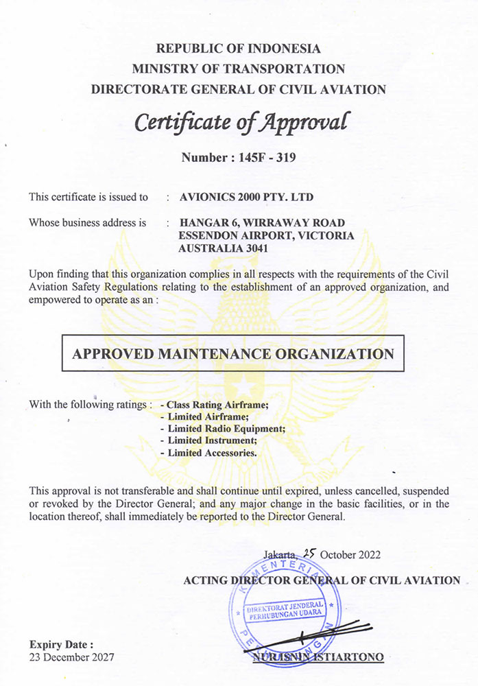 Certificate of Approval – Republic of Indonesia - Ministry of Transportation